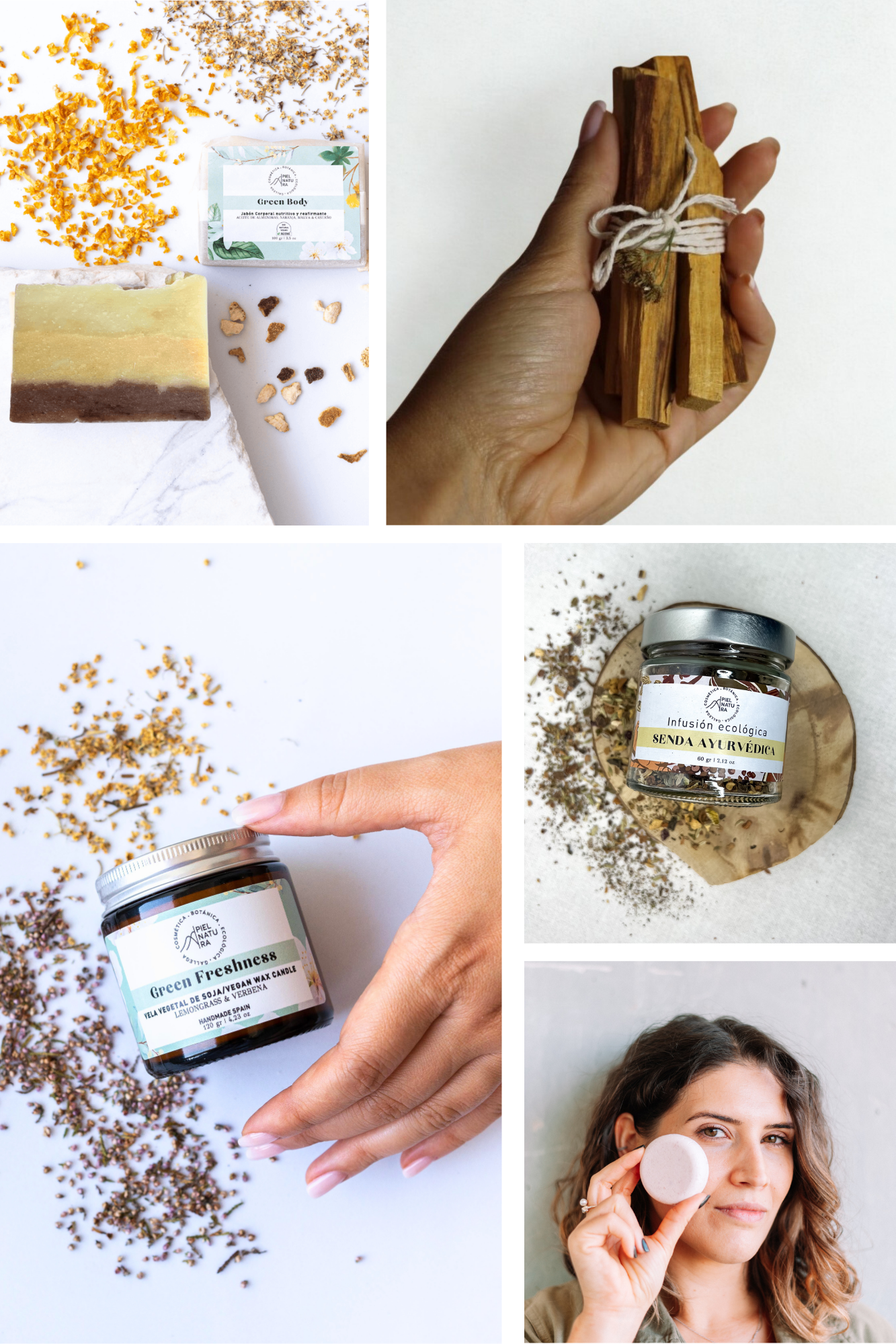 Ritual Renueva tu Energía reúne cuidado, aroma y energía en un solo pack: vela aromática fresca, infusión ayurvédica ecológica, limpiador facial botánico, jabón sólido nutritivo y palo santo natural.